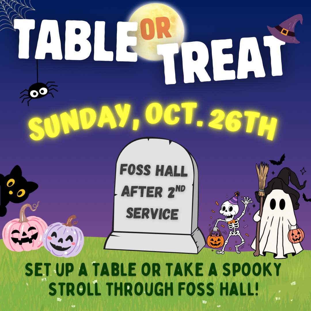 Every October at Columbine we have Table-or-Treat festivities, a community favorite. The past couple of years has been snowy and really cold so last year we held it inside Foss Hall and had folks decorate a table instead of their trunks. It was so much fun and it was more of an intergenerational event! So we have decided to do Table-or-Treat from now on.